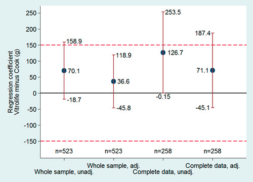 Our results suggest that there is no statistically significant difference of birthweight after embryo culture in Vitrolife® or Cook® media. In the overall study population adjusted for infant’s sex and gestational age, data showed equivalence of the two culture media regarding birthweight. Considering only those patients in which a complete data set was available, permitting adjustment also for maternal risk factors and paternal growth parameters, equivalence of the two culture media could not be shown anymore, as this patient group was underpowered for detecting equivalence between culture media. Therefore, the adjusted whole-sample analysis suggesting equivalence has to be taken with care because bias due to insufficient adjustment for confounders cannot be excluded. Indeed, the adjusted complete-data analysis (fig. 2) suggests a mean difference of 71 g between the two groups, representing only a trend to higher birthweight in the Vitrolife® group. In accordance with the study by Lin et al., we neither found a significant difference in length [9]. Unfortunately, the latter item was not evaluated in the Dumoulin study.