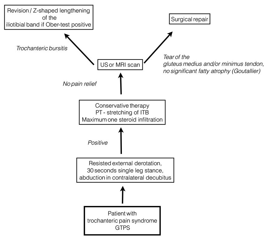Diagnostic algorithm for greater trochanteric pain after total hip replacement [58, 95].