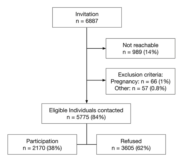 The genetic and phenotypic determinants of blood pressure and other cardiovascular risk factors (GAPP) study is a population-based cohort study from the Principality of Liechtenstein. Details about recruitment and study methodology have been published previously [16]. In brief, between 2010 and 2013, all inhabitants of the Principality of Liechtenstein aged 25–41 years, namely 6887 individuals, were invited to participate in this study. 5775 individuals could be contacted by phone and were eligible. A study flow chart is provided in (fig. 1). Main exclusion criteria were known cardiovascular disease, renal failure, known sleep apnoea syndrome, current intake of antidiabetic drugs, any other major illness, and a Body Mass Index (BMI) >35 kg/m2. Up to December 2013, 2170 participants have been included in GAPP (participation rate of 38%). 13 participants (0.6%) with missing HbA1c levels, 3 with missing smoking status (0.1%) and 12 participants (0.3%) with HbA1c levels >6.4% were excluded from the current analysis, leaving 2142 participants. The study protocol was approved by the local ethics committee. Informed written consent is obtained from each participant.