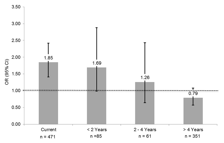 The fully adjusted OR for exposure to any secondhand smoke was 1.00 (95% CI 0.93; 1.08) compared with never smokers. Among individuals indicating an exposure to secondhand smoke of <1, 1–2 and >2 hours per day, the multivariable adjusted ORs (95% CI) were 0.97 (0.68; 1.39), 0.92 (0.48; 1.78) and 1.00 (0.60; 1.68), respectively.