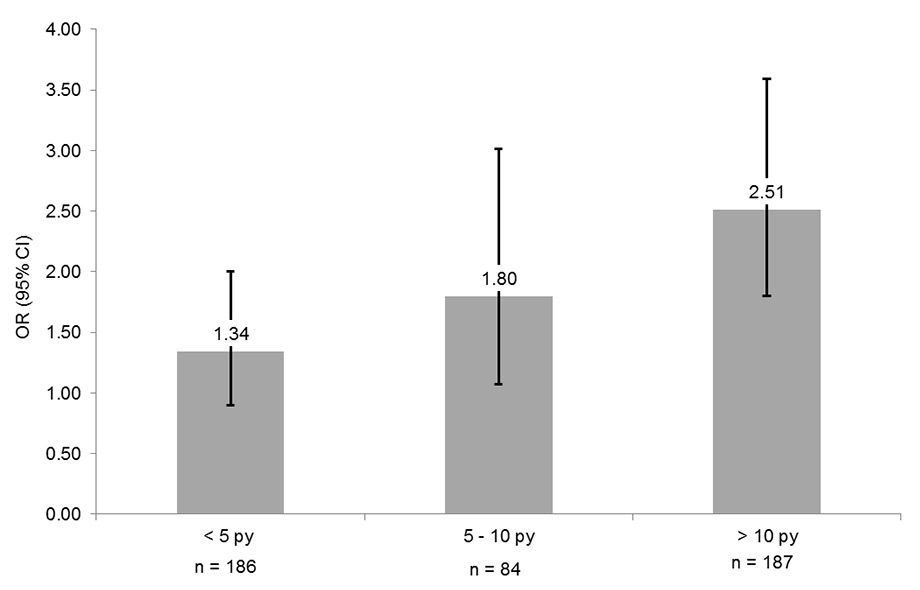 Dose response relationships using pack-years of smoking are shown in table 3 and (fig. 2). A cumulative smoking exposure of <5, 5–10 and >10 pack-years was associated with a crude OR (95% CI) of 1.05 (0.73; 1.53), 1.67 (1.03; 2.71) and 2.60 (1.89; 3.61), respectively (p for linear trend <0.0001). Again, this relationship was only minimally affected by multivariable adjustment, such that the fully adjusted ORs (95% CI) were 1.34 (0.90; 2.00), 1.80 (1.07; 3.01) and 2.51 (1.80; 3.59), respectively (p for linear trend <0.0001).