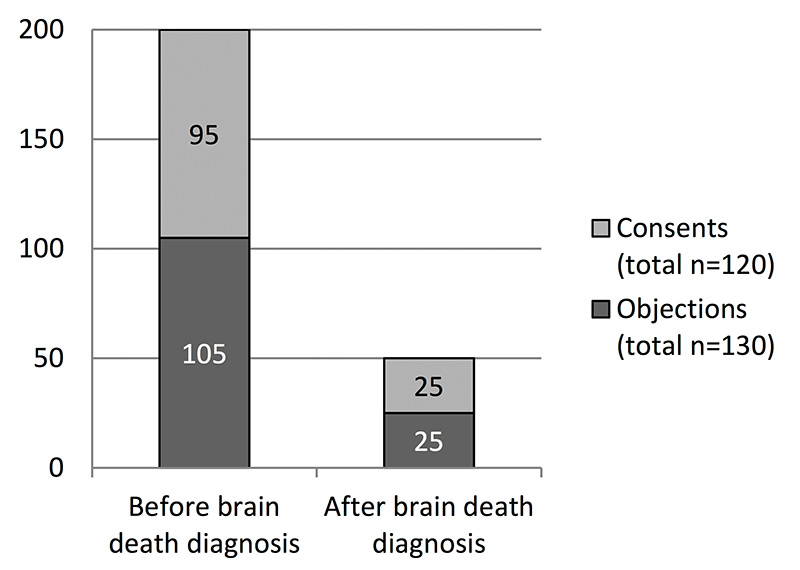 Consent to organ donation was sought in a total of 250 cases, resulting in 120 consents and 130 objections. This is equivalent to an overall 48.0% consent rate (the number of consents to organ donation expressed as a percentage of the total of consents and objections). As shown in figure 2, 80.0% of requests were made before brain death diagnosis was completed and only 20.0% after. The proportion of consents and objections was very similar regardless whether the requests took place before or after brain death was diagnosed. The conversion rate (the number of UTID expressed as the proportion of the number of POTD) was 47.5%.