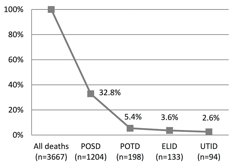 All deaths (n = 3,667/100%) | POSD (n = 1,204/100%) | POTD (n = 198/100%) | ELID (n = 133/100%) | UTID (n = 94/100%) | |