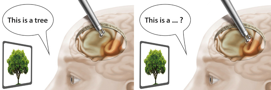Left: the patient correctly names items during electrical stimulation of non-eloquent areas and tumour tissue. Right: speech anomalies during stimulation reveal eloquent areas (brown) that need to be spared to avoid postoperative speech deficits.
