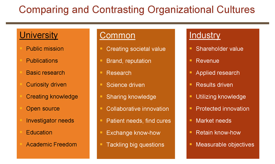 Comparison of the organisational cultures in universities and in the pharmaceutical industry. The traditional view on the collective processes and values that make up culture are indicated in the left and the right panels. Successful collaborations defy the polarised view, have a shared purpose and follow a paradigm based on common beliefs and assumptions (middle panel).