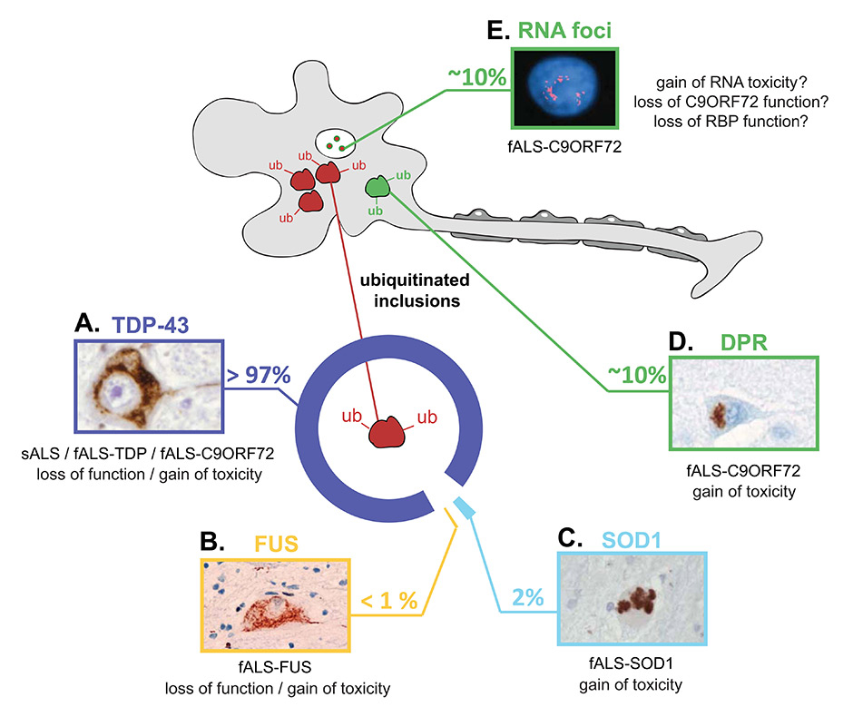 The pathologic hallmark of ALS is the presence of ubiquitinated protein inclusions in motor neurons and glial cells primarily of the spinal cord and motor cortex. The major protein component of these inclusions is different in the various types of ALS, highlighting the heterogeneity of the disease. (A) In the majority of ALS cases, including all sporadic and most familial cases, the ubiquitinated inclusions contain TDP-43. When TDP-43 accumulates in the cytoplasm, it is excluded from the nucleus, where it normally resides in healthy cells. These alterations suggest that either loss of normal TDP-43 function or gain of toxicity (or both) may trigger motor neuron dysfunction and death. (B) In 0.5% of fALS that carry mutations in FUS, the cytoplasmic inclusions do not contain TDP-43, but they contain FUS protein. Similar observations to that of TDP-43, with partial nuclear clearance of FUS suggest that its neurotoxity may be the result of either loss of function or gain of toxicity. (C) In fALS patients with SOD1 mutations, misfolded SOD1 accumulates and becomes toxic to neurons. These patients do not contain any TDP-43 or FUS inclusions. (D) In contrast, patients with hexanucleotide repeat expansions in C9ORF72show typical TDP-43, similar to those found in sALS (A). In addition, C9ORF72 patients accumulate abnormal dipeptide repeat (DPR) proteins, which are produced by an unconventional type of translation of the hexanucleotide repeat RNA, which escapes the nucleus, and binds to ribosomal complexes. In addition to spinal cord motor neurons, DPRs have been observed in the cerebellum, which is typically spared in non-C9ORF72 ALS. (E) In addition to TDP-43 and DPR pathology, C9ORF72 patients accumulate nuclear RNA foci that contain sense and antisense hexanucleotide repeats in neuronal and glial cells. Insert images reproduced with permission from (A) [54], (B) [60], (C) [35], (D) [39], (E) [20].