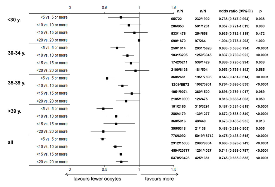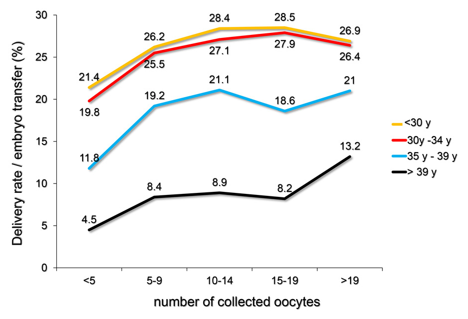 B Delivery rates and their relationship with the number of collected oocytes and the age of the treated infertile women at oocyte collection, using the pooled FIVNAT-CH data collected between 2005 and 2012. Among all treated patients the delivery rates per embryo transfer significantly depended on the quantity of retrieved oocytes (p <0.0001), but this dependence was less pronounced among younger patients. In each age category the number of deliveries was significantly lower if fewer than five oocytes were retrieved. In all age categories (except those older than 39 years) the delivery rates were not further improved if more than 15 oocytes were collected.