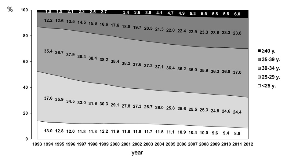 A Age of women giving birth in Switzerland between 1993 and 2012 was extracted from the data base constructed and published by the Swiss Federal Office of Statistics (BfS). During this observation period the proportion of women giving birth at the age of 35 to 39 years or older has nearly doubled, whereas the age of women giving birth at the age of 40 years or older has risen more than threefold.