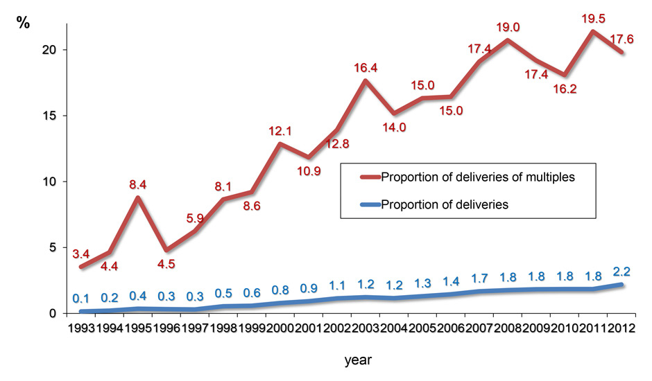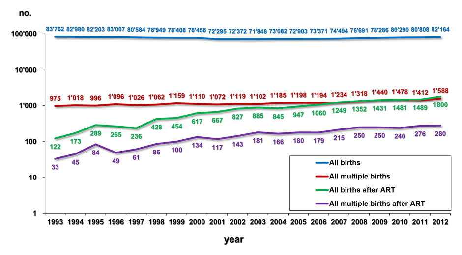 B Since 1993, the proportion of births generated by ART has been rising almost continuously, so that in 2012 2.2% of all deliveries in Switzerland were originated by ART. In addition, the proportion of multiple deliveries generated by ART has risen to 17.6% of all multiple births in Switzerland in 2012.