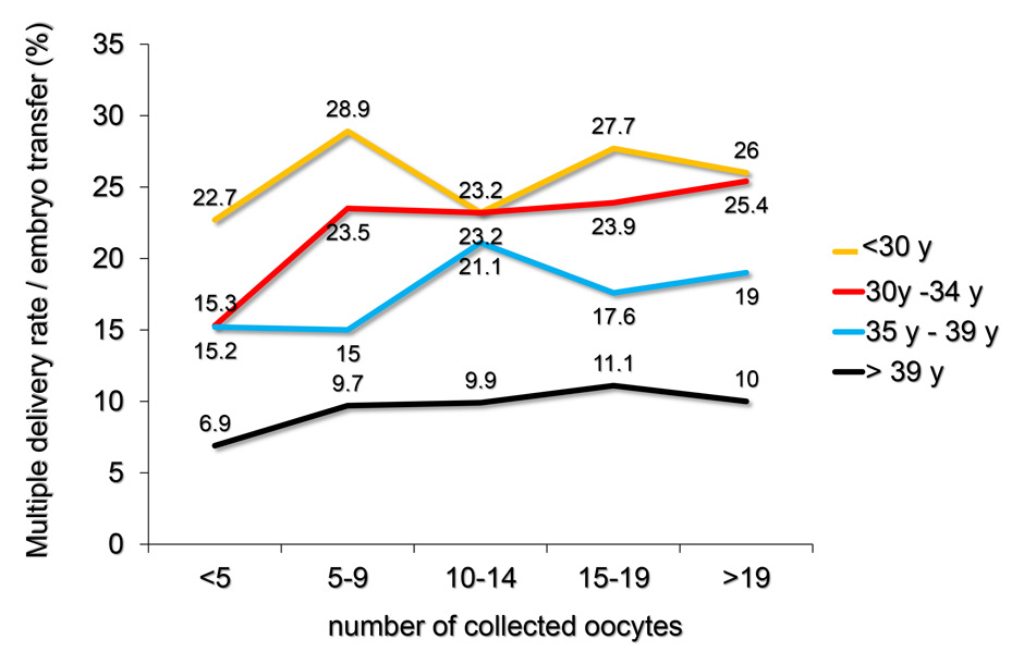 A Using the pooled FIVNAT-CH data, the relationship between the number of retrieved oocytes, the mean age of the treated patients at oocyte collection and the incidence of multiple deliveries was assessed during the observation period from 2005 to 2012. The incidence of multiple deliveries most strongly depended on the age of the treated women and to a lesser extent on the number of collected oocytes.