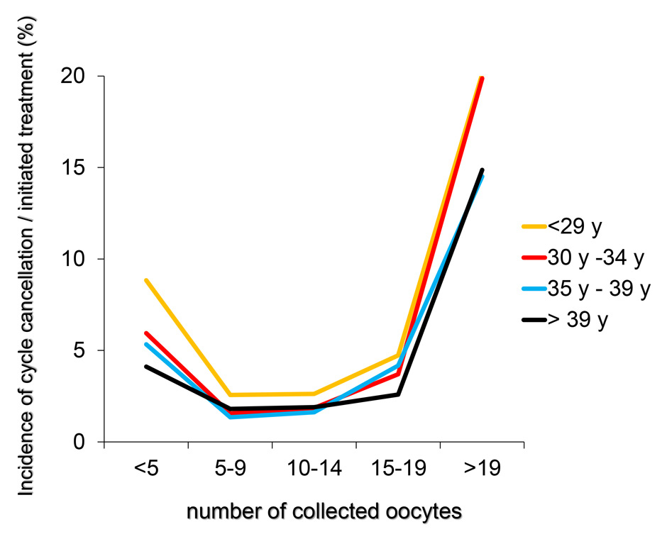 A‒C The incidence of OHSS per initiated controlled ovarian hyperstimulation (in %, panel A), the cancellation rate per initiated cycle and the incidence of OHSS per embryo transfer (in %, panel C) taken from the pooled FIVNAT-CH data collected between 2005 to 2012 were computed in relationship to the number of collected oocytes and the age of the treated infertile patients. The incidence of OHSS rises significantly if more than 14 oocytes are collected. In 17.8% of all treatment cycles in which 19 or more oocytes were collected embryo transfer was cancelled to avoid OHSS. Among all age groups, the cancellation rate was the highest when fewer than five oocytes or 19 or more oocytes were collected (panel B).