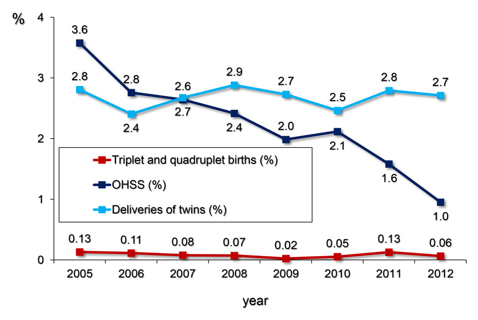 The yearly proportion (%) of twin, triplet and quadruplet deliveries per treatment cycle with ART (including both fresh and thawing cycles) and the proportion of OHSS per freshly stimulated treatment cycles (in %) was calculated from the pooled FIVNAT-CH data collected between 2005 and 2012. While the number of multiple births has remained constant, the incidence of OHSS dropped from 3.6% 1.0%.
