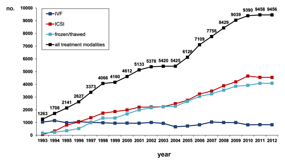 B During the observation period between 1993 and 2012 the number of treatments with ART, including IVF, ICSI and the transfer of frozen/thawed embryos and oocytes at the pronucleate stage, has risen almost continuously, as evidenced by the Swiss ART data registry, FIVNAT-CH.