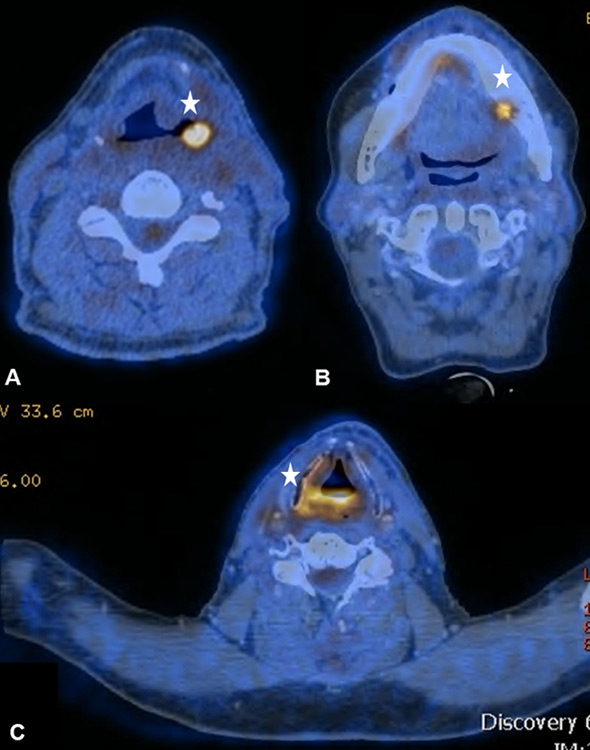 (A) Sixty-two year old patient after curative radio-chemotherapy (RCT) for a supraglottic larynx carcinoma with increased focal uptake in the left hypopharynx due to a radiogenic ulcer. (B) Increased focal uptake of the left mandible due to osteoradionecrosis in a 48-year old patient after curative RCT for an oropharynx carcinoma (C) Radiogenic chondronecrosis of the corniculate cartilages in a 59-year old patient after surgical resection and radiation therapy of a base of tongue carcinoma