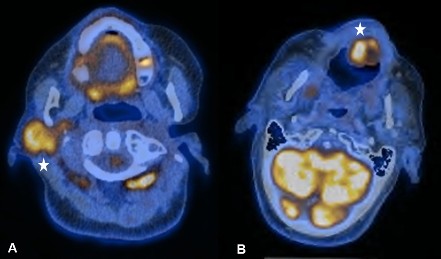 (A) Bilateral physiological uptake in the palatine tonsils in a 83-year old patient with a past medical history of a floor of nose melanoma. (B) Symmetric increased uptake in the muscles of mastication in 71-year old patient treated for tonsillar carcinoma.