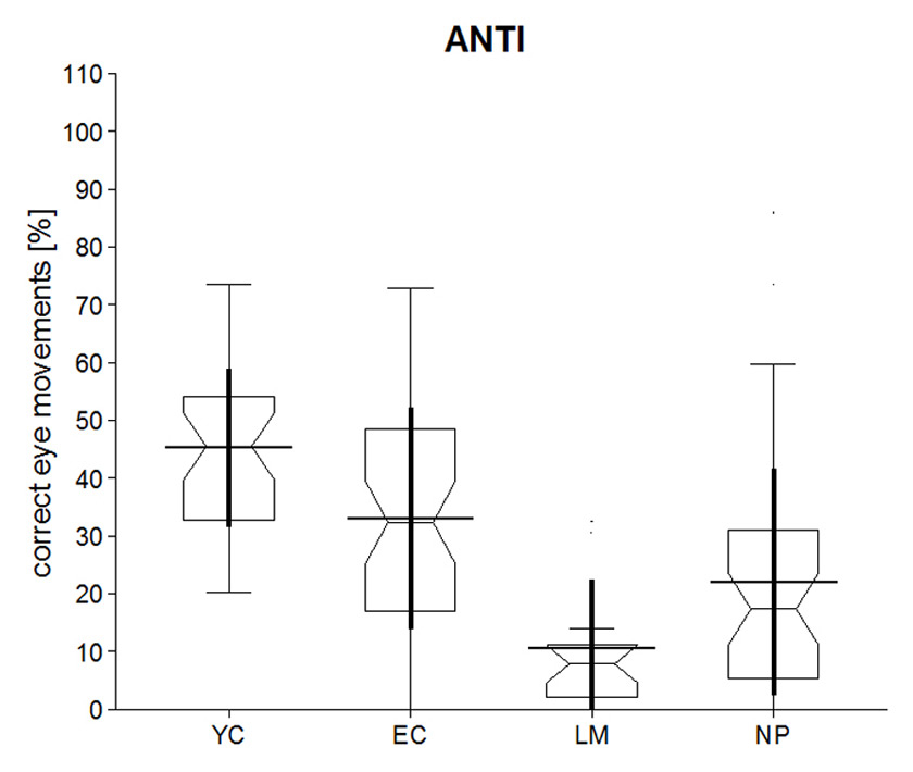 In the antisaccade task, Group LM had a significantly lower number of correctly performed antisaccades than both comparison groups. A mean value of 10.6% (±12.0% SD) correctly performed eye movements was recorded for Group LM. Patients with brain lesions (Group NP, 22.1% ± 19.7%) performed better than Group LM, but the difference was not statistically significant. Older controls (Group EC) achieved a mean of 33.1% (±19.1%) correct, and the younger comparison group (Group YC) a mean of 45.3% (±13.7%) correct. Group YC performed significantly better than all groups, including the older controls. Both comparison groups made significantly more correct antisaccades than Groups LM and NP.