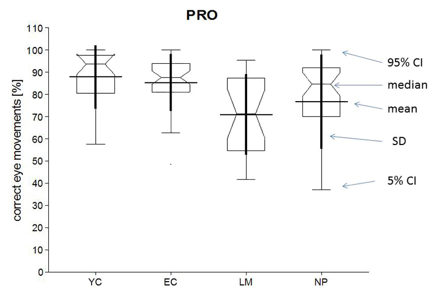 Evaluation of all prosaccades for all groups. The percentage of correctly performed eye movements is presented; boxes indicate the distribution of the data include mean and SD (thick line), median, confidence intervals (5%, 95%) and outliers (single dots).