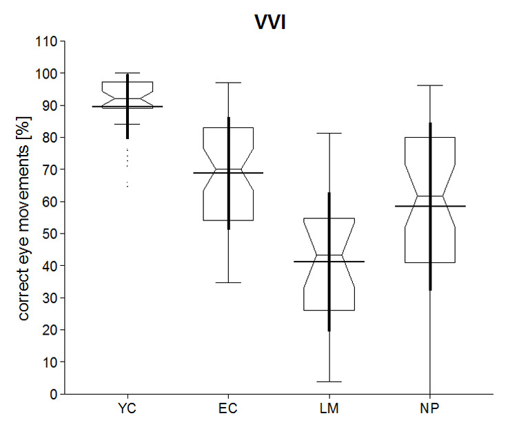 Concerning the VVI paradigm, it was found that Group YC achieved a significantly higher percentage of correct trials compared with Group LM (and all other groups). In addition, Group LM had fewer correct trials than the older comparison group.