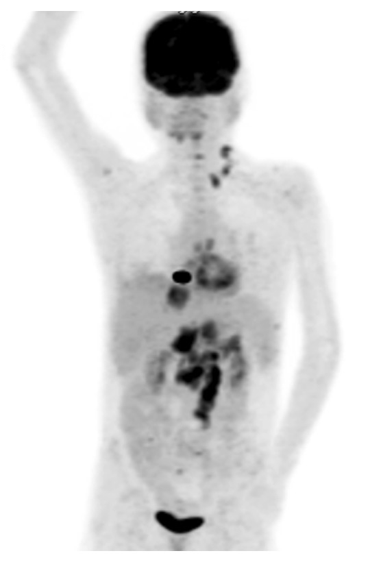 Positron emission tomography-computed tomography scan showing fluorodeoxyglucose uptake in the liver, bones and lymph nodes (highlighted Virchow’s node in the left supraclavicular area).