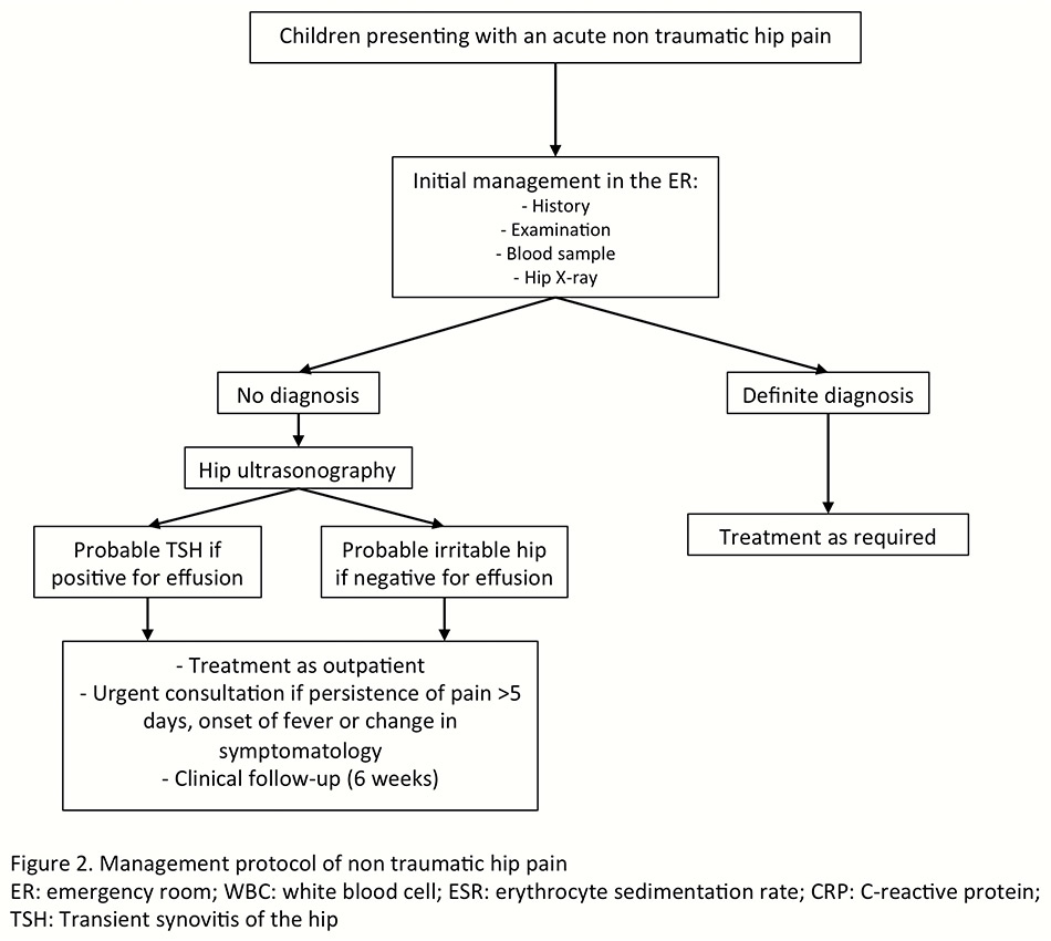 This study confirms that a vast majority of children with acute hip pain or limp suffer from TSH, a benign and self-limiting condition. Children with suspicion of TSH may therefore be treated on an outpatient basis, provided that severe hip disorders, such as septic arthritis of the hip or acute SCFE, have been ruled out. Therapeutic measures such as skin traction are probably unnecessary and the use of anti-inflammatory and pain managing medication alone may help to alleviate the symptoms. With respect to this particular point, we have currently changed our practice, as hospitalisation and skin traction are no longer used in our department. Specific investigations are probably not fundamental, especially if symptoms have been present for less than a few days. The consequences of such common practice may lead to unnecessary costs as well as patient and parental distress. Thus, initial investigations should, in our opinion, include WBC count, CRP and ESR, and X-rays imaging of the hip (fig. 2). In the absence of a definite diagnosis, we suggest hip ultrasonography should be performed. In the presence of hip effusion without suspicion of septic arthritis, patients could be considered to have a probable transient synovitis of the hip. In the absence of hip effusion, children may be considered to have a so-called irritable hip. However, other diagnoses, such as osteomyelitis, should be kept in mind and excluded in the case of persistence of symptoms. In both situations, children may be treated on an outpatient basis and parents must be told to seek medical care urgently in the event of any change in symptomatology, onset of fever, or persistence of pain. Children should be referred to their paediatrician or paediatric orthopaedist for a check-up 6 weeks after the initial workup only in the case of persistence of symptoms. Also, radiographic views are unnecessary during follow-up for TSH in the asymptomatic child. Finally, screening for rheumatological diseases, acute rheumatic fever, post-streptococcal reactive arthritis, or Lyme disease is not justified at the time of presentation at the emergency room.