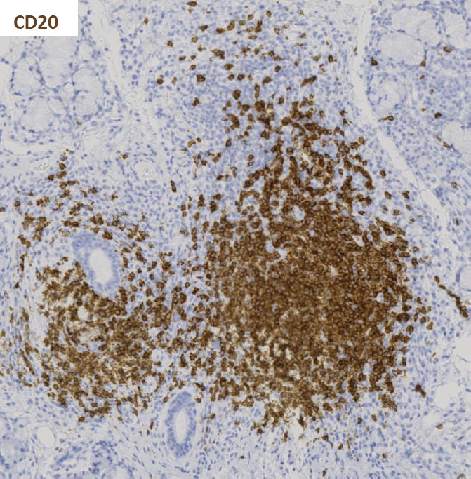 Immunohistochemistry staining for CD20 and CD3 in sequential sections of a labial salivary gland sample showing a large, segregated focus with a predominant B cell infiltrate.