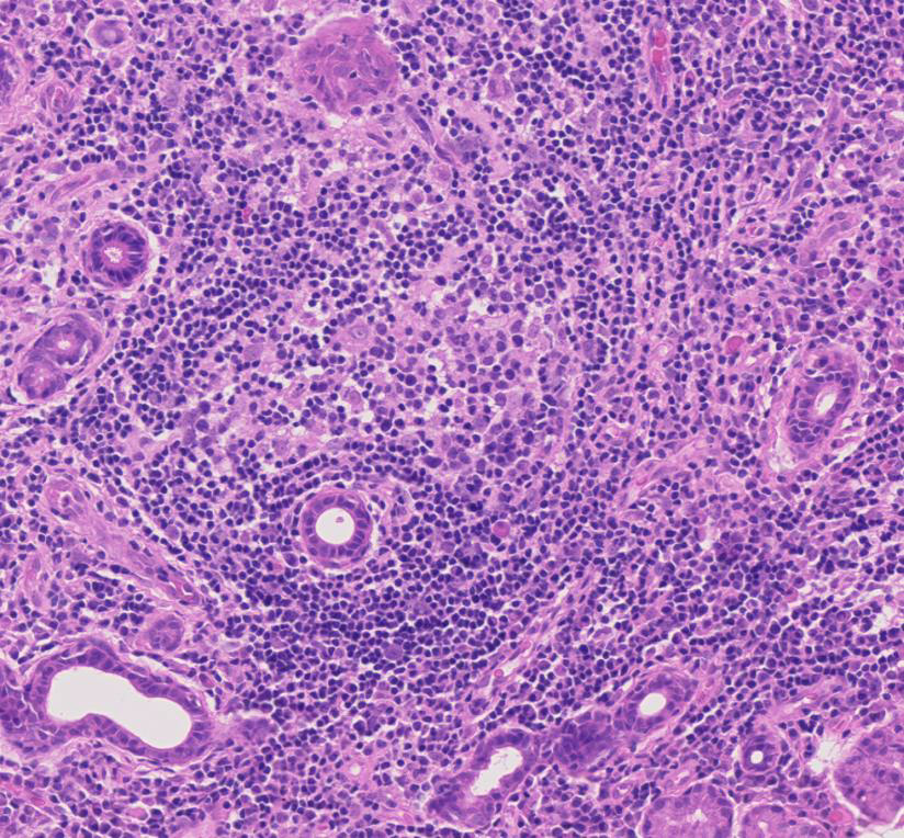 Haematoxylin and eosin staining of labial salivary gland biopsy with evident lymphoepithelial lesion.