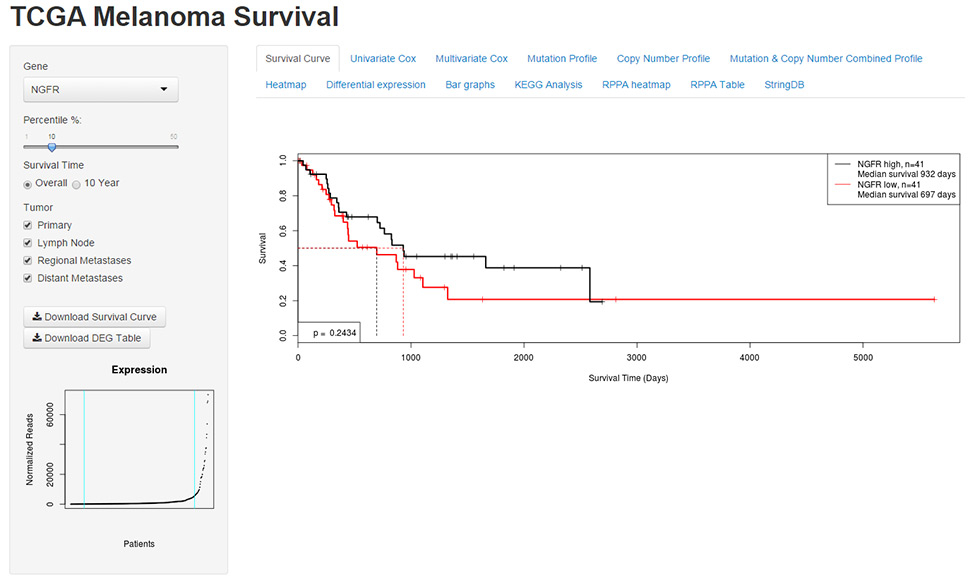Snapshot of UZH Cancer Browser. Left panel shows selectable parameters for gene, patient percentile, survival time and tumor type. Normalised expression of NGFR accross all patients can be seen in the scatterplot in the bootom left corner. In the main panel of the webtool, tabs for the analysis modules can be selected for visualisation. In this snapshot the survival curve module is selected and the Kaplan-Meier plot is shown.