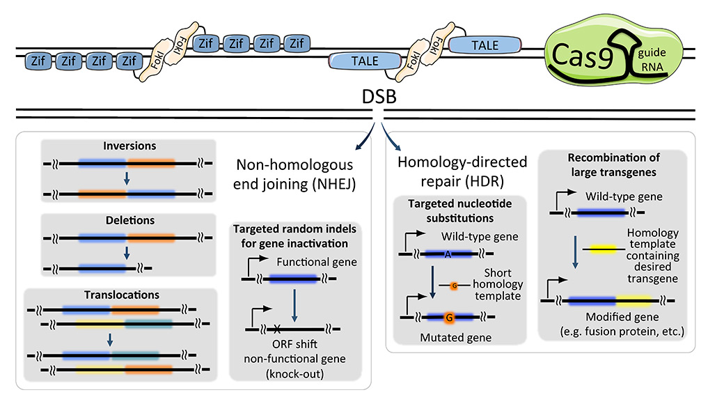 Comparisons of programmable nucleases and possible outcomes.Zinc finger nucleases (top left), transcription activator-like effector nucleases (TALENs; top middle) and CRIPSR/Cas9 (top right) systems introduce a site-directed double strand break (DSB) in DNA. Depending on the repair mechanism, nonhomologous end joining (NHEJ) or homology-directed repair (HDR), the site of interest can be left with random mutations, designed mutations, insertion of large transgenes, or (in case more than one DSB is generated), inversions, deletions and translocations.