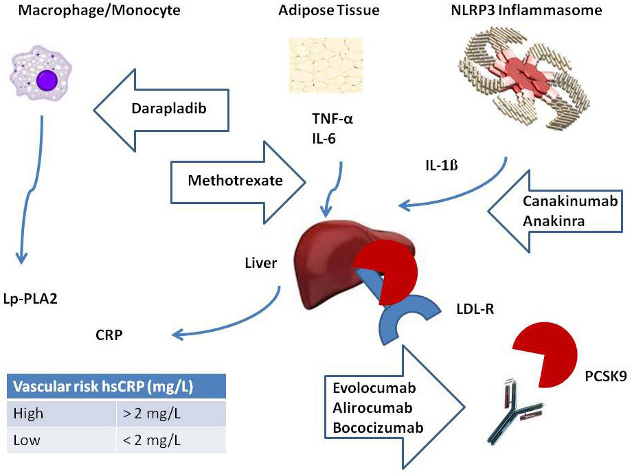CANTOS = Canakinumab Anti-inflammatory Thrombosis Outcomes Study; CIRT = Cardiovascular Inflammation Reduction Trial; hsCRP = high-sensitive C-reactive protein; IL = interleukin; LDL-C = low-density lipoprotein cholesterol; LDL-R = low-density lipoprotein receptor; PCSK9 = proprotein convertase subtilisin / kexin type 9; SOLID-TIMI 52 = stabilization of plaque using darapladib-thrombolysis in myocardial infarction 52; STABILITY = stabilization of atherosclerosis plaque by initiation of darapladib therapy. TNF = tumour necrosis factor; VCU-ART = Virginia Commonwealth University anakinra remodeling trial.