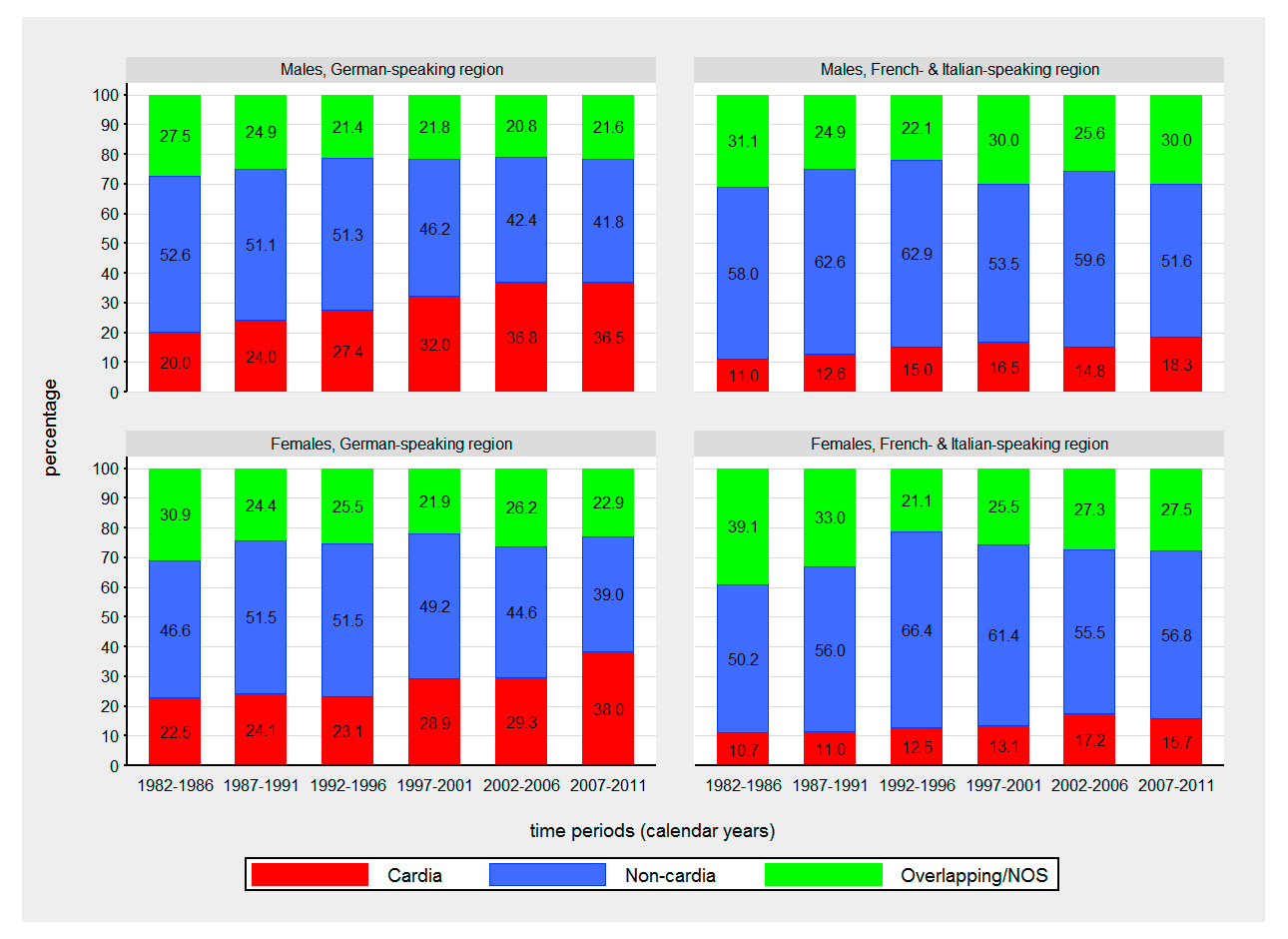 For cancer of the gastric cardia, we observed stable rates in both sexes and language regions. Similar results have been reported from other developed countries (Australia 1982–1993 [26], Finland 1976–1995 [48], Netherlands 1973–2011 [49], Spain 1980–2004 [6]). In contrast, an increase of both oesophageal adenocarcinoma and cancer of the gastric cardia has been observed in Scotland (1978–1997) [7], eastern-England (1995–2006) [8] and the US (1974–1994) [3]. Since our analyses were based on data with high proportions of cases with unspecified anatomical location they should be interpreted with caution.