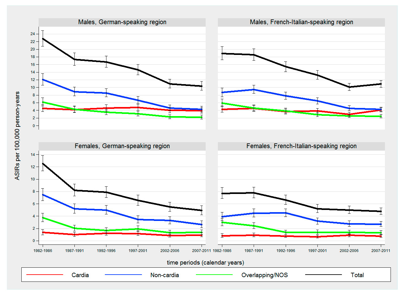 Population coverage of the German-speaking region was below 50% for all time periods under investigation. Therefore, incidence figures for the German-speaking region might be less precise than for the French-Italian speaking region. Another weakness of this study is the relatively large proportion of cancer cases with unspecified anatomical location. This was particularly true for gastric cancer, with approximately 16% of all analysed cases in this group. Because of high proportions of cases with unspecified location (>20%), cases from ZH and TI had been excluded for all analyses stratified by anatomical location. Population coverage for these analyses dropped by around 25% and 14% for the German-speaking region and French-Italian-speaking regions, respectively. Therefore these results should be interpreted with caution. Further, the formation of the language regions based on cantonal borders is just an approximation of the natural language regions of Switzerland. Some cantons are part of more than one language region. However, as cantonal information was the most detailed geographical information available, no more accurate allocation was possible within this work.