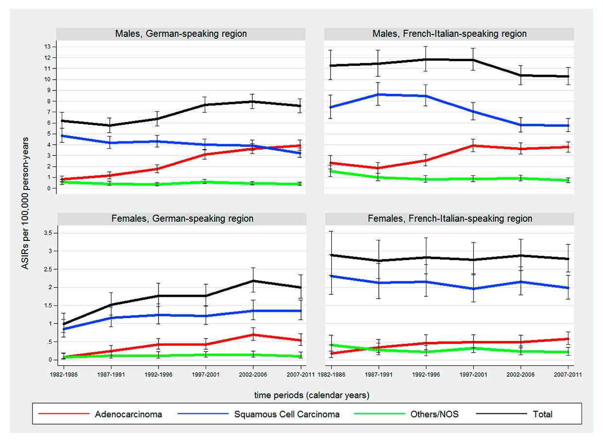 Time trends in age-standardised incidence rates (ASIRs) (European standard population) of oesophageal cancer by sex, histological subtype and language region from 1982 to 2011.