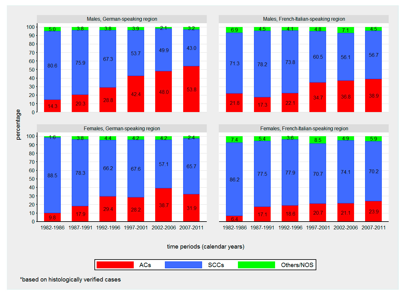 We observed a substantial increase of oesophageal adenocarcinoma in Switzerland, as in other developed countries [3–11, 25–29]. In the German-speaking region of Switzerland, a continuous increase of oesophageal adenocarcinoma was observed throughout the study period, whereas a plateau was reached in males of the French-Italian-speaking region from 2001 onwards after a previous increase. In males of the German-speaking region oesophageal adenocarcinoma has become the predominant histology since 2007, accompanied by a corresponding decline of oesophageal squamous cell carcinoma.
