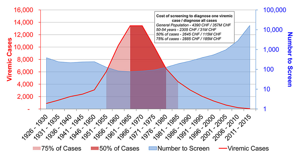 Globally, there is a growing need for effective diagnosis and screening strategies targeting patients with hepatitis C virus (HCV) infection. Despite frequent use, the success of risk based screening falls short of its potential [1]. This may be due in part to a patient’s hesitation to disclose their current or prior risk status, or to a lack of knowledge of risk status [2]. In 2013 the US Preventive Services Task Force recommended birth cohort screening to compliment current screening efforts among high risk populations [3]. A recent study conducted by the Swiss Federal Office of Public Health analysed the birth year distribution of all reported HCV cases and concluded that 60% were born between 1955 and 1974 [4]. The present analysis sought to identify which birth cohort would require the least screening in order to diagnose one new viraemic HCV infection. In addition, it compared the direct cost of screening several different birth cohorts.