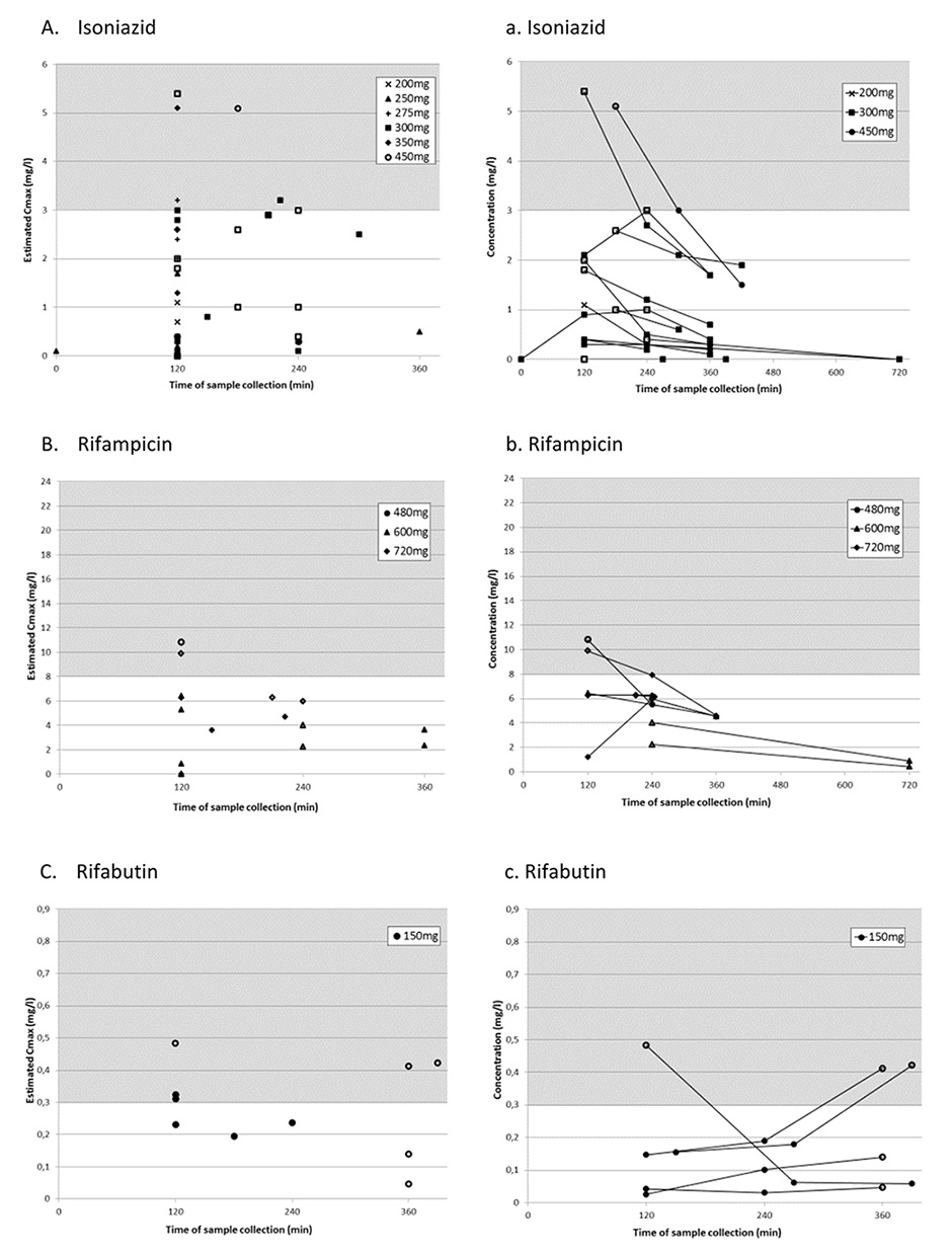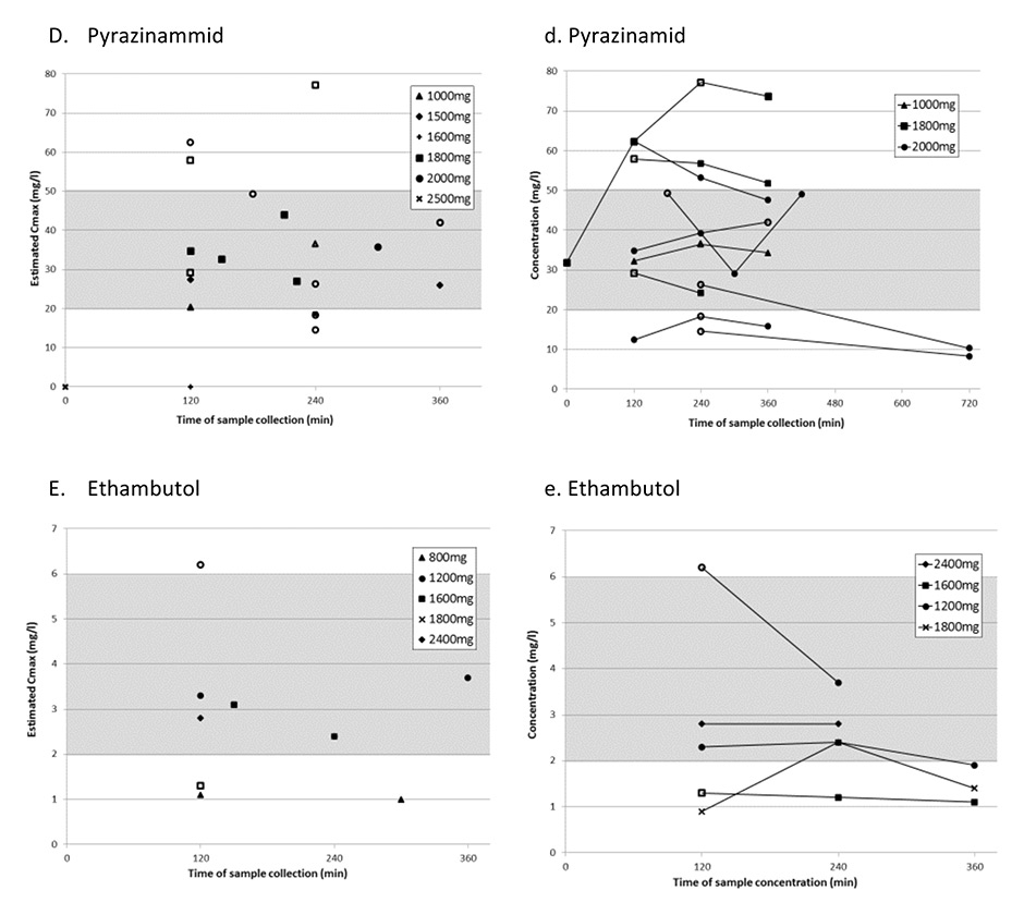 Panels A-E represent the highest measured concentration (estimated Cmax) from each sampling period for each antituberculosis drug with its corresponding dosages.