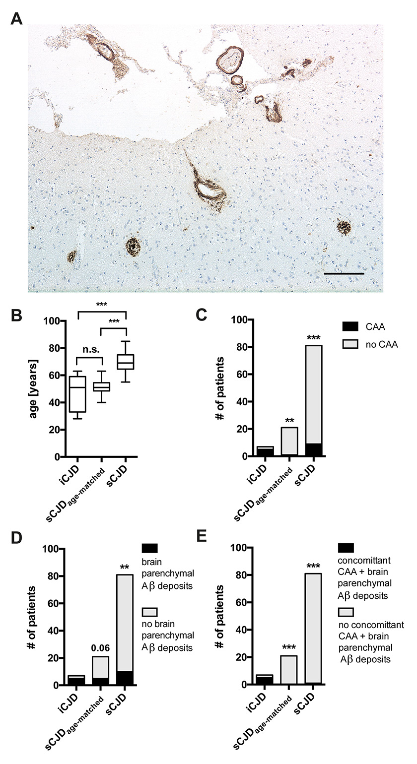 B–E: Statistical comparisons of iCJD, age-matched sporadic CJD (sCJD) and non-age-matched sCJD for age (B), cerebral amyloid angiopathy (CAA) (C), brain parenchymal deposits (D), and concomitant CAA and brain deposits (E). B: Bars are median + 25%/75% percentile (box) and min/max (whiskers). ** p <0.01, *** p <0.001.