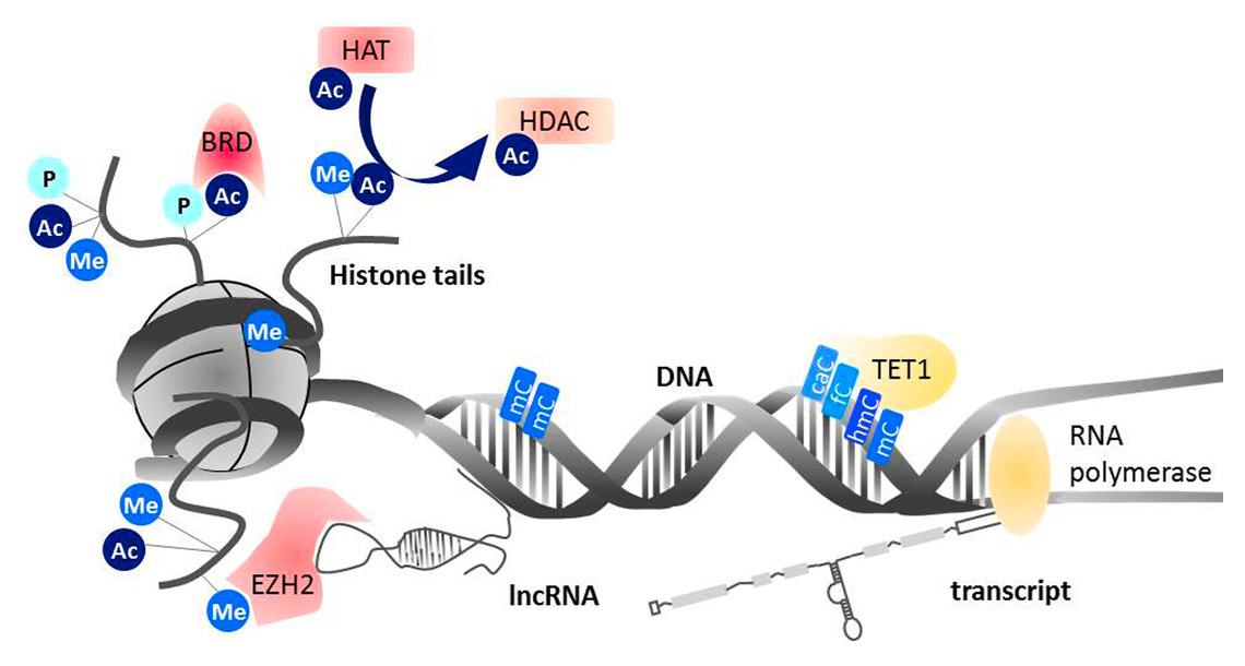 Acetyl (Ac), phospho (P) and methyl (Me) residues are placed on specific amino acids of the protruding histone tails by writer proteins. Histone acetyl transferases (HATs) and histone deacteylases (HDACs) are the readers and writers of acetylation, respectively. Bromodomains (BRDs) bind acetylated histone tails and promote the formation of multiprotein complexes. The methyltransferase EZH2 is bound to long non-coding RNA (lncRNA), which confers sequence specific location. On the DNA, ten-eleven translocation (TET) proteins convert methylated cytosines (mC) to carboxylcytosine (caC), formylcytosine (fC), and hydroxylmethylcytosine (hmC). Modified from [48] Kyburz D, et al. Epigenetic changes: the missing link. Best Pract Res Clin. 2014;28(4):577–87, with permission from Elsevier.