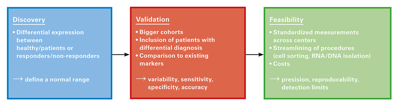 The development of a clinically useful biomarker requires several separate studies and analysis. Unfortunately in rheumatology most of the biomarker studies are in the discovery phase, but have neither been validated nor tested for their feasibility.