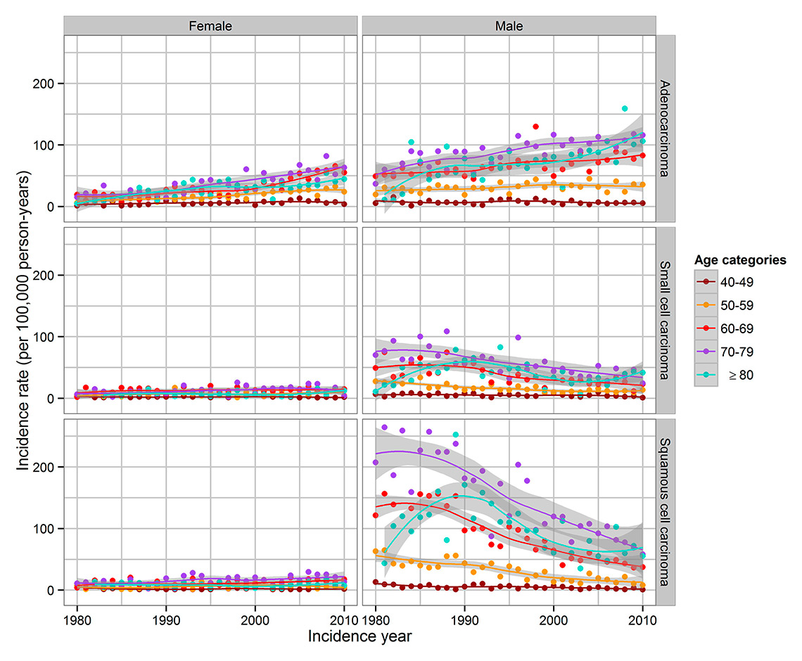 Incidence rates (IRs, cases per 100 000 person-years) were calculated using a weighted average of rates in 5-year age groups according to the European standard [23]. IRs for ten-year age cohorts (40–49, 50–59, 60–69, 70–79 and ≥80 years) were calculated for the major histological subtypes ADC, SCC and small cell carcinoma (SCLC). Confidence intervals were calculated for all IRs using the delta method (confidence intervals of the log rates and back transformation to rates).