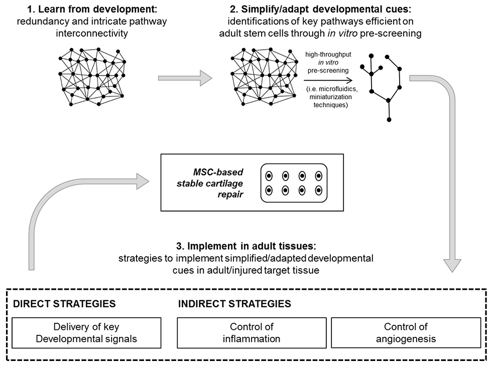 In this section we provide a more detailed description of our vision for exploiting the paradigm of developmental re-engineering towards MSC-based approaches for cartilage regeneration and repair.