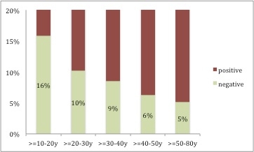 We found a decreasing trend for varicella seronegativity with increasing age (p = 0.008, fig. 1). Those aged less than 40 years were significantly more often seronegative (137/1435, 9.5%) than those aged 40 years and above (19/314, 6.0%, p = 0.049). Overall, slightly more males were seropositive than females (92.7% vs 89.6%, p = 0.024).