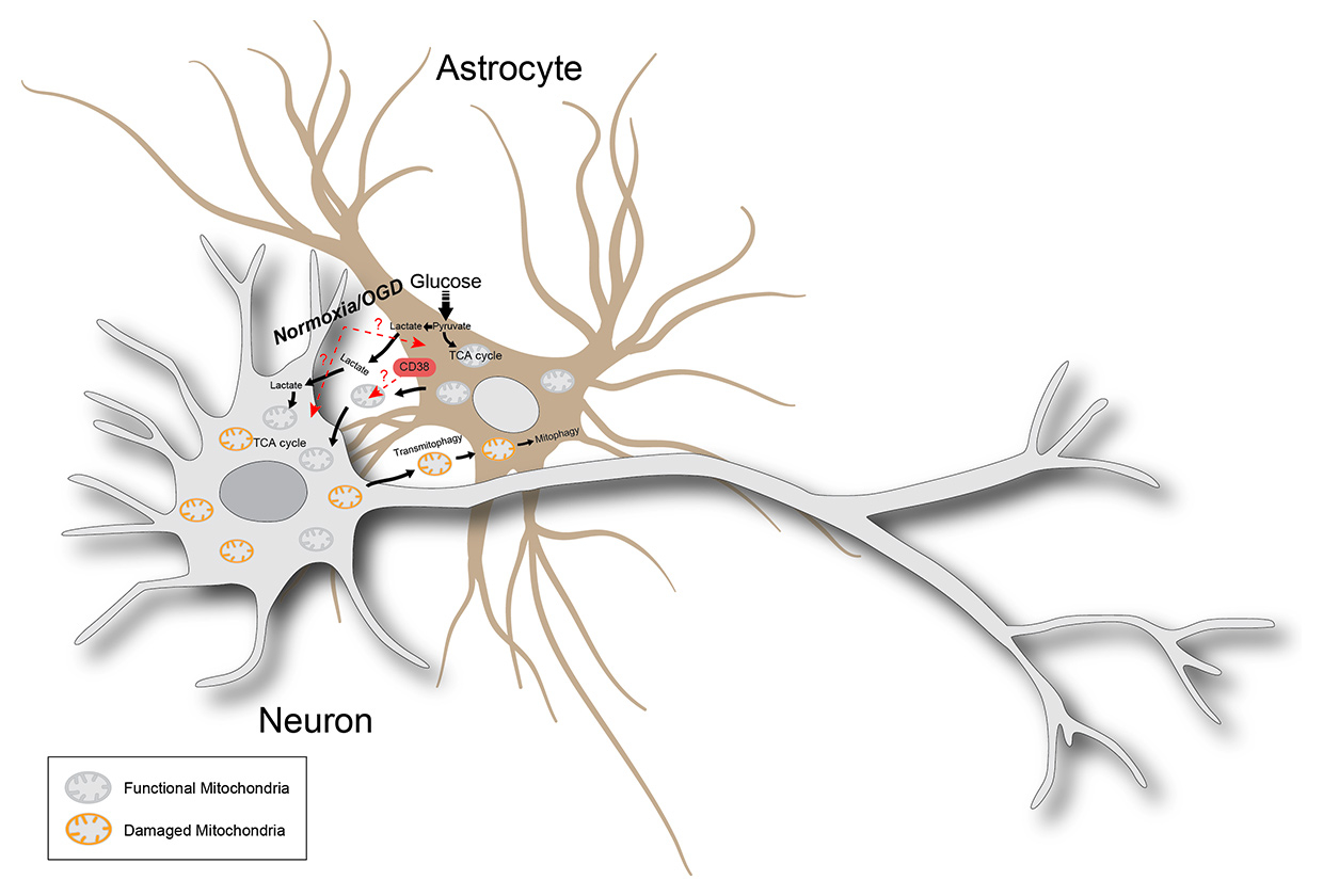 To assess the mechanisms of mitochondria secretion by astrocytes the authors focused on the expression of CD38. CD38 catalyses the synthesis of cyclic ADP-ribose (cADPR) in mitochondrial membranes, increases in astrocytes in response to glutamate release from neurons [1] and has been implicated in neuroglial crosstalk. Of note, over-expression of CD38 in astrocytes led to a significant increase in cyclase activity, extracellular ATP and O2 consumption in secreted mitochondrial particles [1]. Importantly, the rescue effect of astrocyte-derived mitochondria on OGD neurons was also impaired when astrocytes were pre-treated with a small interfering RNA (siRNA) to silence Cd38 [1].
