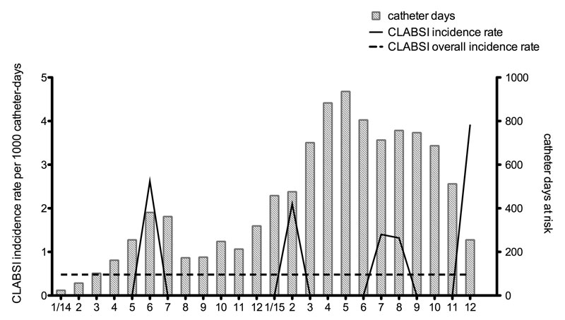 Figure 1 Incidence rate of central line-associated bloodstream infections (CLABSIs) per catheter-days per month.
