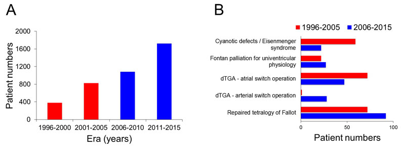 Figure 1 Evolution of patient numbers during the study period (red bars represent the first and blue bars the second decade of the study period). Panel A: Numbers of patients at the end of each 5-year era of the study period. Panel B: Comparison of newly referred patients with selected congenital heart defects, between the first and second decade of the study period.