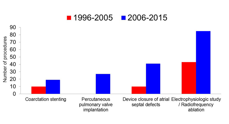 The increase in percutaneous interventions was even more pronounced. During the study period, 233 patients (14%) had at least one percutaneous intervention and 47 patients (3%) had more than one and up to five interventions. The number of percutaneous interventions increased from 84 procedures within the first decade of the study period to 218 procedures within the second decade of the study period, an increase of 159%. The most common procedures were electrophysiological studies / radiofrequency ablations (128 procedures), device closure of atrial septal defects (51 procedures), coarctation stenting (29 procedures) and percutaneous pulmonary valve implantation (27 procedures). The increase among these frequent procedures during the study period is illustrated in figure 2.