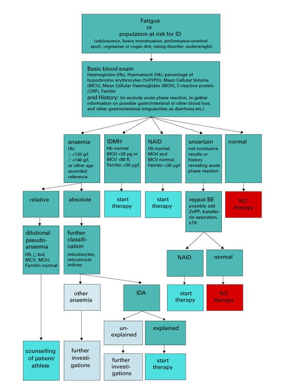 The basic measurements needed to diagnose iron deficiency are shown in table 3: these are haemoglobin, haematocrit and erythrocyte count, with calculation or measurement of the red cell indices mean corpuscular volume (MCV) and mean corpuscular haemoglobin (MCH), the percentage of hypochromic erythrocytes (%HYPO), ferritin and C-reactive protein. The algorithm presented in figure 2 summarises the diagnostic process.