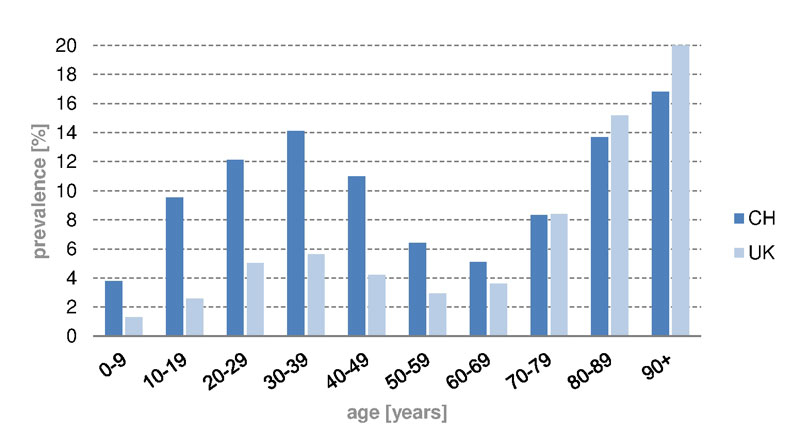 Figure 1 Prevalence of iron substitution in different age groups in Switzerland and the UK, 2012 to 2014.