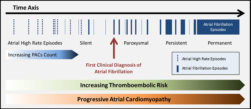 Figure 3 Example of the evolution of atrial fibrillation over time. The first clinical diagnosis of atrial fibrillation may shift along the time axis to occur earlier or later, depending on individual circumstances. PACs = premature atrial complexes.