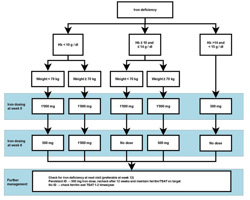 In our institution, dosing is based on the simplified regimen of the CONFIRM-HF study (fig. 2). Of note, there are no data on the safety of intravenous iron substitution in patients with CHF and haemoglobin levels >15 g/dl. However, a comprehensive work-up for potentially treatable or reversible causes (e.g., gastrointestinal bleeding) of iron deficiency is crucial if clinically suspected. Furthermore, effects of treatment that can be expected, as well as potential adverse events, need to be discussed individually with each patient.