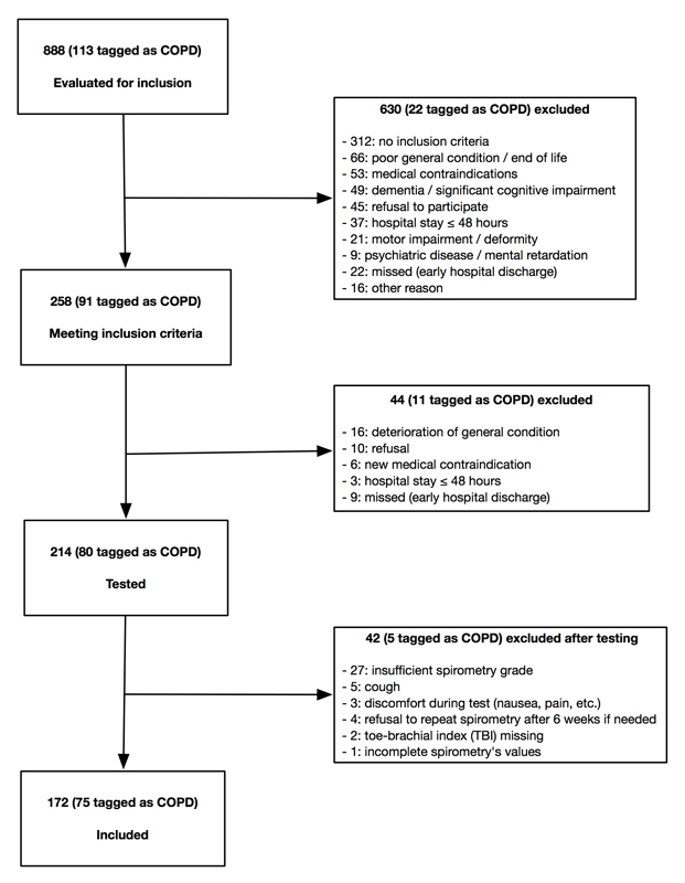 Figure 1 summarises the evaluation and inclusion processes. We evaluated 888 patients the working day following their hospital admission, of whom 113 (13%) had in their medical record a history of COPD, chronic bronchitis or lung emphysema (patients tagged as COPD). We excluded 630 patients because they did not meet the inclusion criteria or presented one or several exclusion criteria. The 258 remaining patients were re-evaluated after 48 hours of clinical stability. Of these, 44 presented new exclusion criteria. A total of 214 patients were eventually tested, of whom 40 could not be included because of a spirometry examination of insufficient grade, discomfort while performing the test or refusal to repeat spirometry after 6 weeks if needed. Amongst the 174 remaining patients, 2 were eventually excluded because a TBI was needed to confirm PAD diagnosis but could not be performed. Finally, 172 patients were included, of whom 75 (44%) were tagged as COPD. During this evaluation process, 31 patients of the cohort (3.5%) could not be evaluated, essentially because of early hospital discharge, and appear as “missed”. The definitive inclusion rate was 19.5% of all evaluated patients, and 66.5% of the patients tagged as COPD.